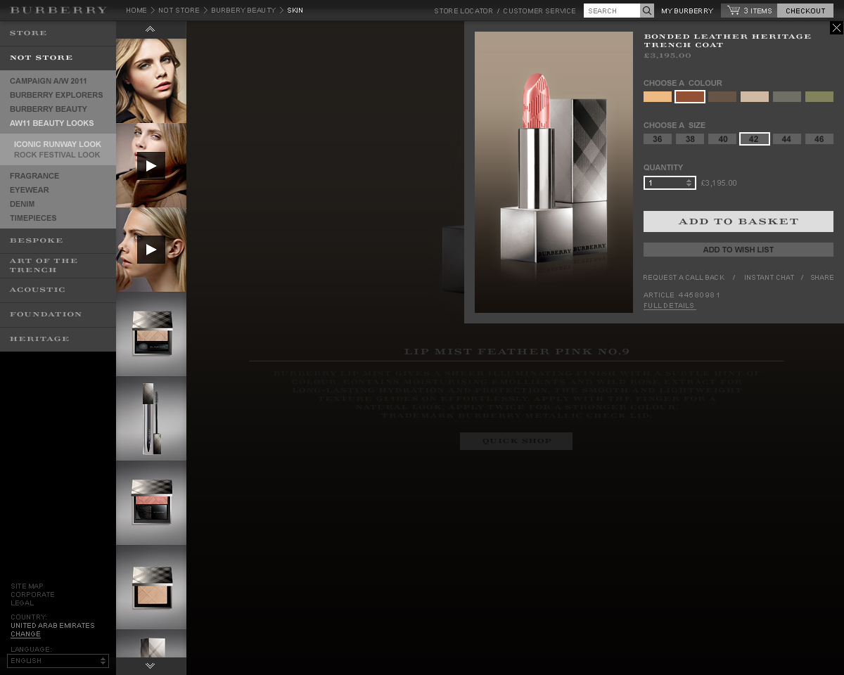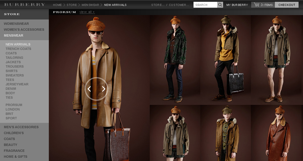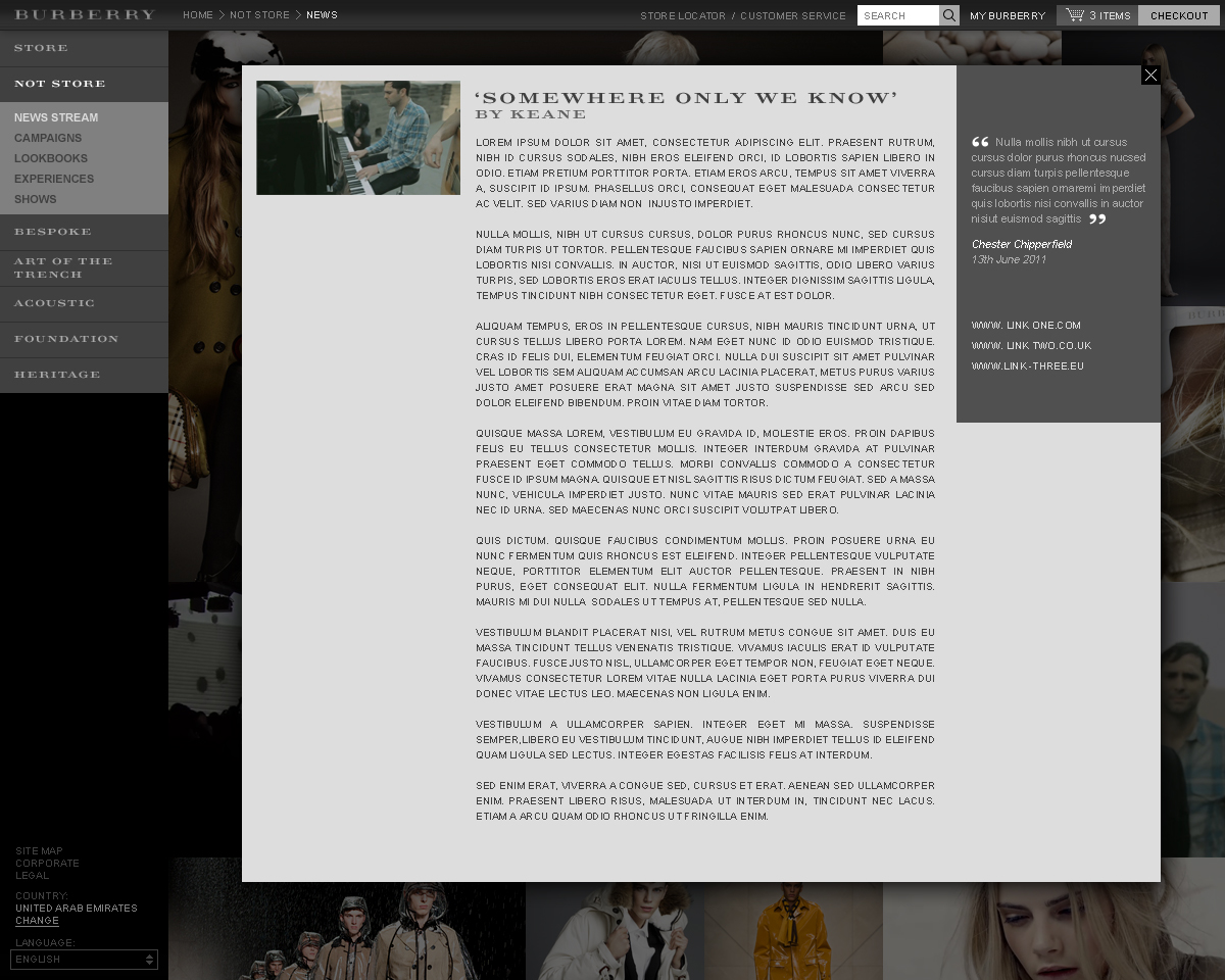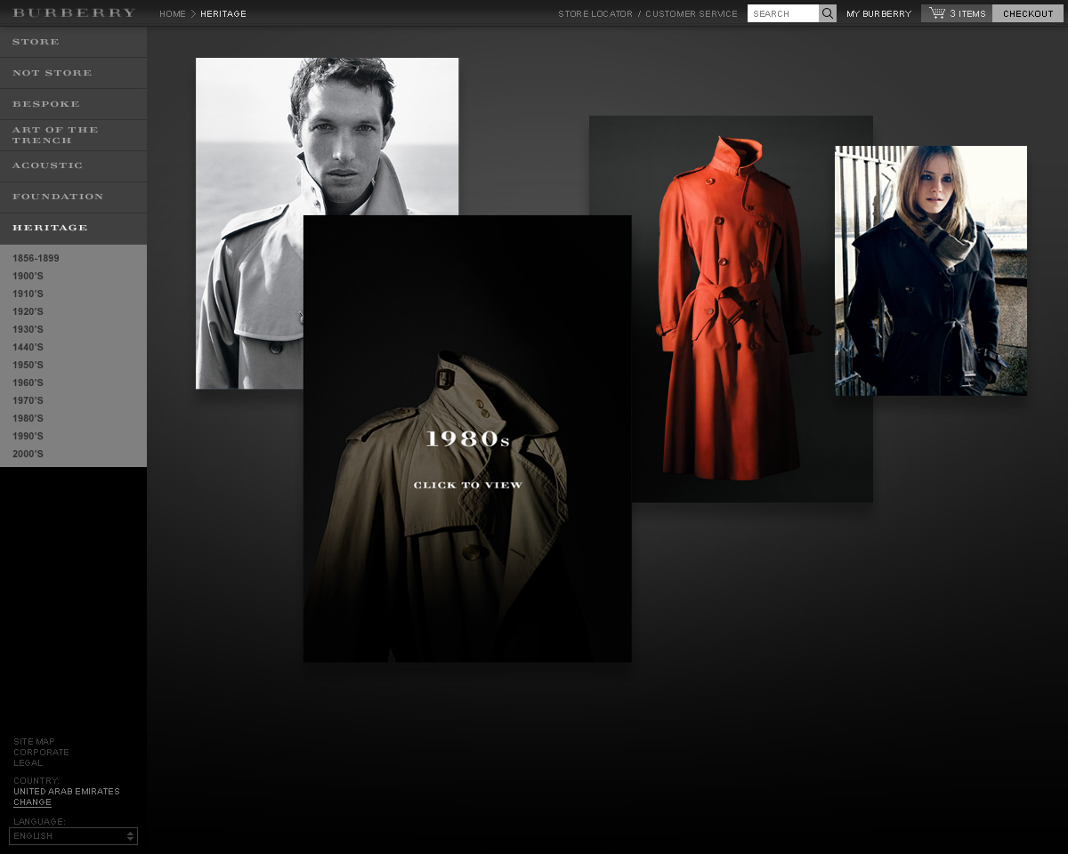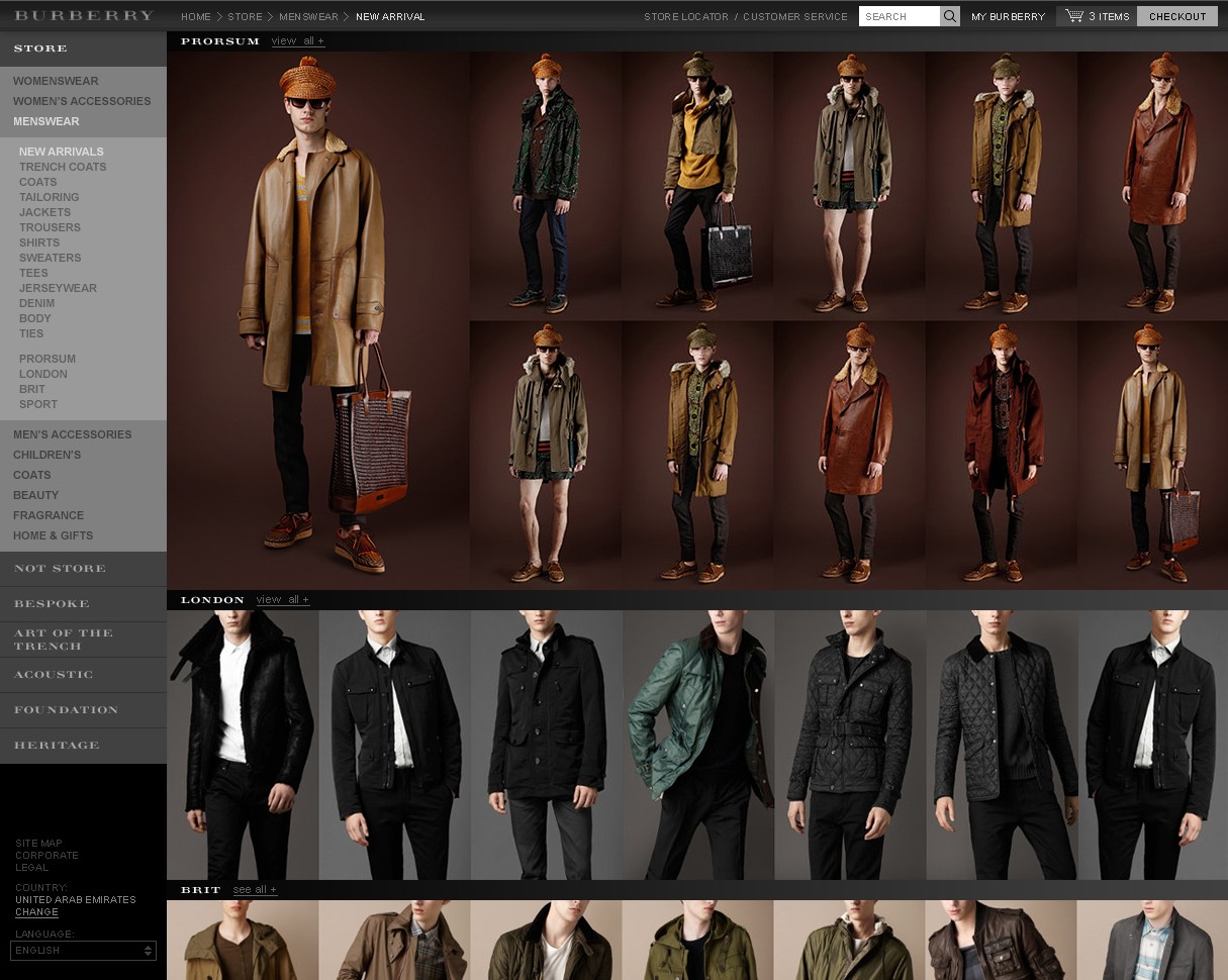 A selection of other pages from the re-design of the iconic Burberry website.