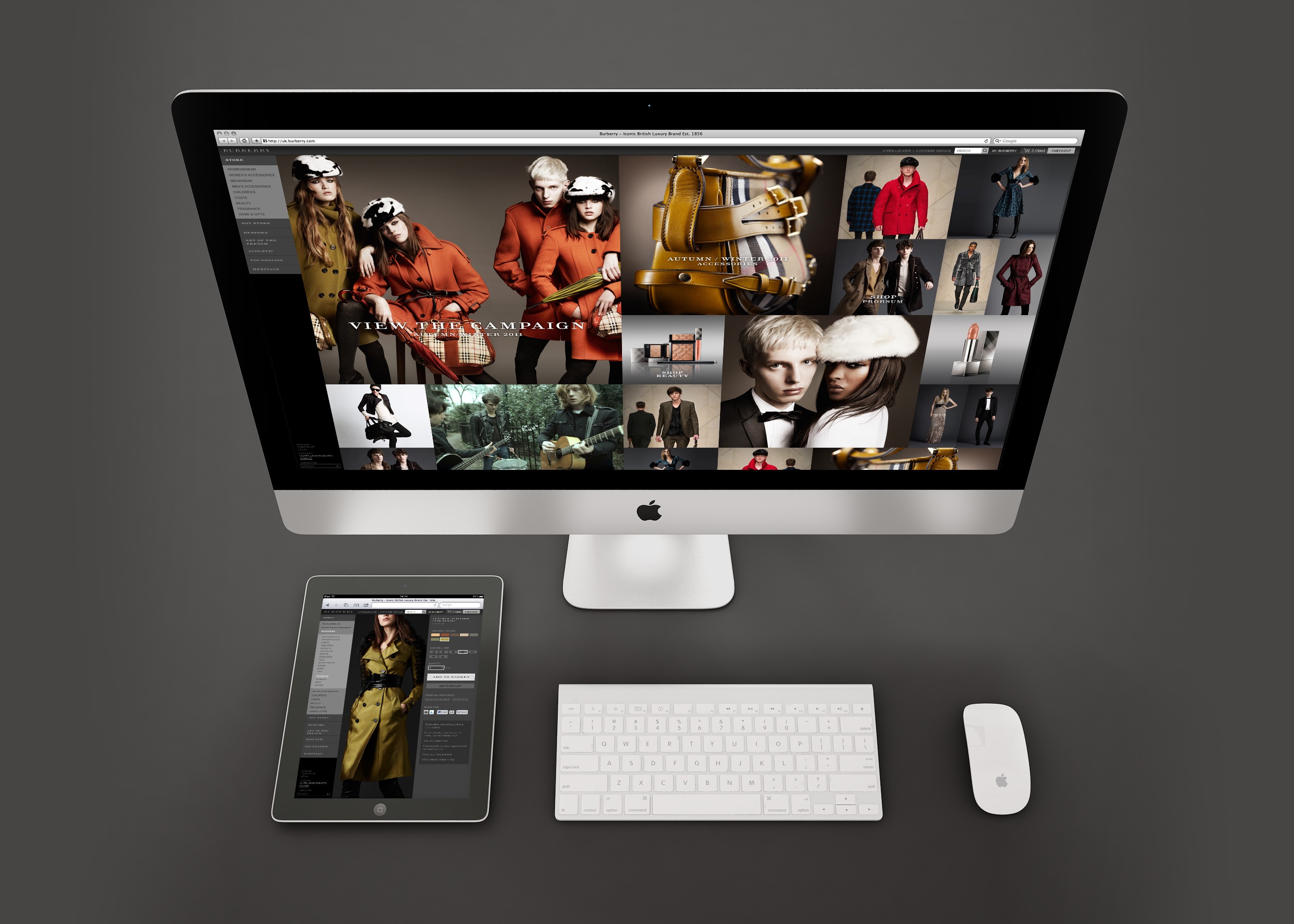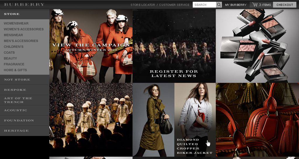 Burberry used to have had a desktop only website. It was built using Flash and had no e-commerce platform. I was hired to re-design the site for multiple screen sizes. It was not to be built in Flash anymore, but it would now have a new online store.